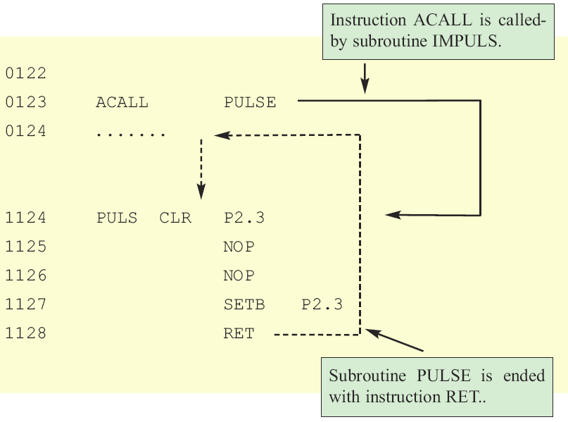 Description: This instruction ends every subroutine. After execution, the program proceeds with the instruction following an ACALL or LCALL.
